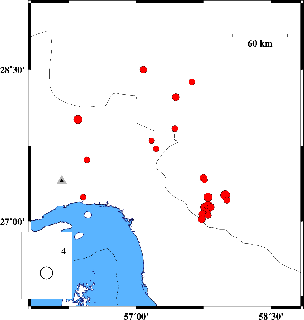 2019/11/18 | 08:08:59.6 | 11:38:59.6 | 28.16 | 57.55 | 14 | ML:3.6 | Kerman Province, 27 km North-West of Kahnuj | ||