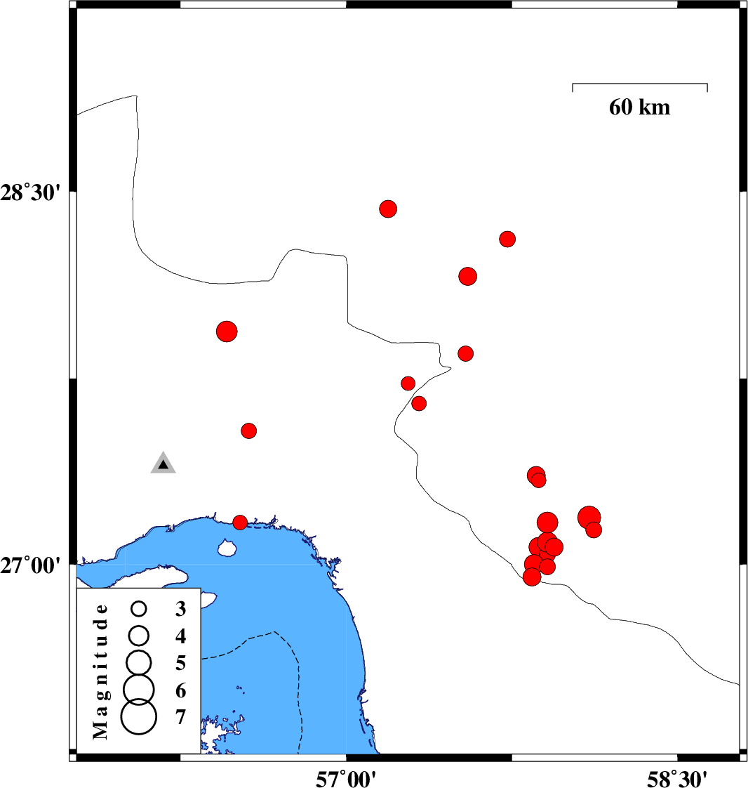 2019/11/18 | 08:08:59.6 | 11:38:59.6 | 28.16 | 57.55 | 14 | ML:3.6 | Kerman Province, 27 km North-West of Kahnuj | ||