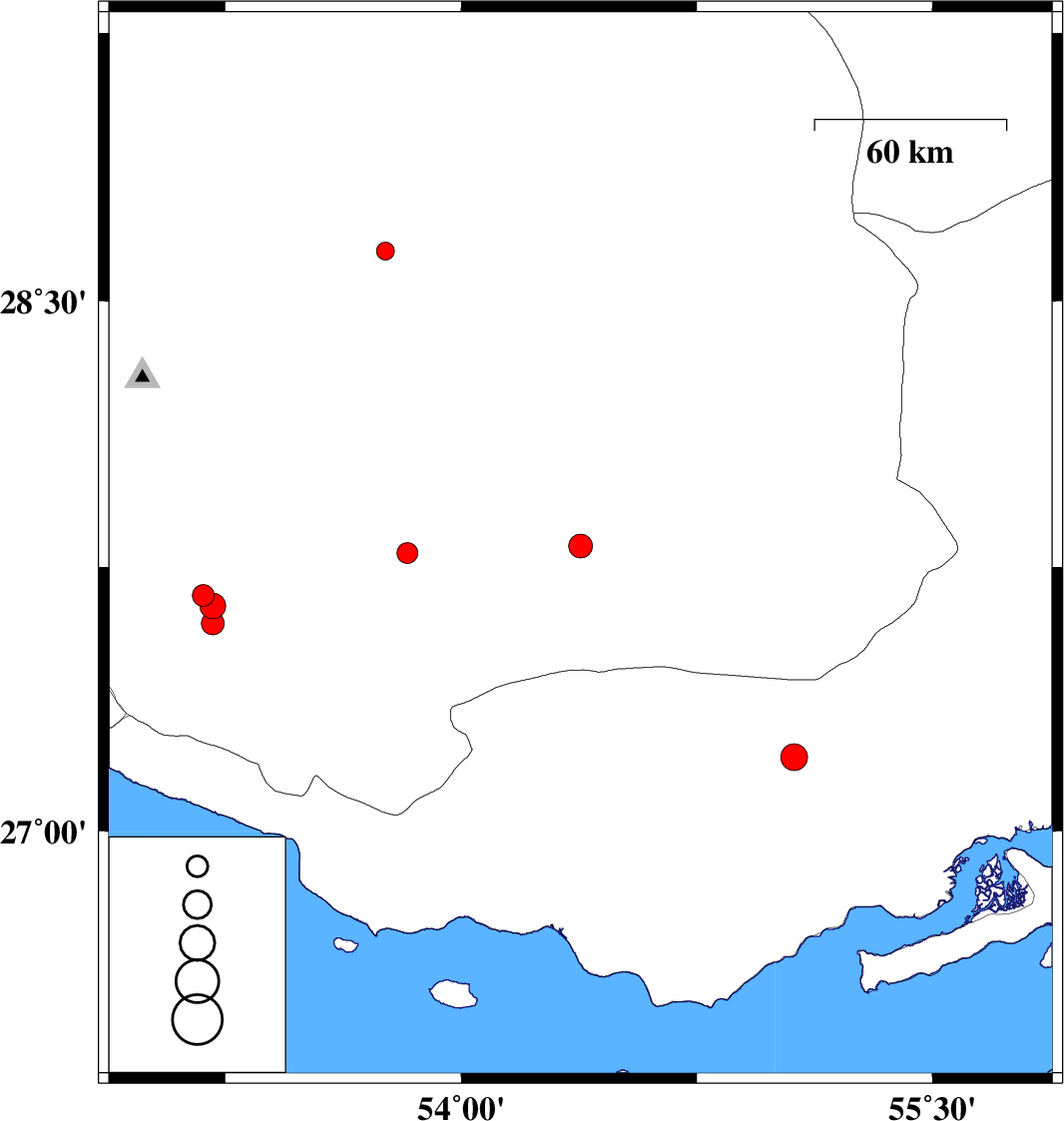 2019/12/22 | 04:45:35.3 | 08:15:35.3 | 27.59 | 53.21 | 17 | ML:3.2 | Fars Province, 29 km North of Lamerd | ||