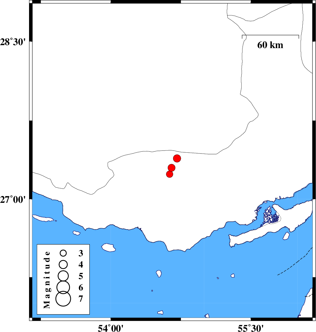| 2020/10/26 | 17:28:14.1 | 20:58:14.1 | 27.36 | 54.66 | 10 | ML:3.6 | Hormozgan Province, 34 km North-East of Bastak |