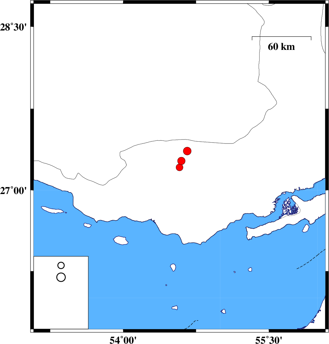 | 2020/10/26 | 20:24:58.2 | 23:54:58.2 | 27.27 | 54.6 | 10 | ML:3.5 | Hormozgan Province, 25 km -East of Bastak | ||