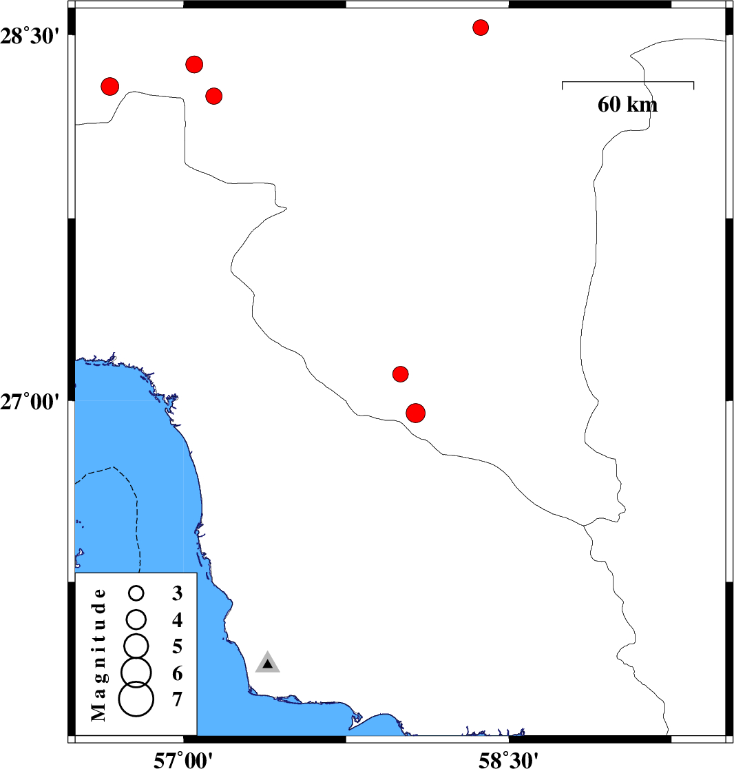 | 2020/12/29 | 22:18:36.2 | 01:48:36.2 | 28.25 | 57.14 | 10 | ML:3.4 | Kerman Province, 64 km North-West of Kahnuj | ||