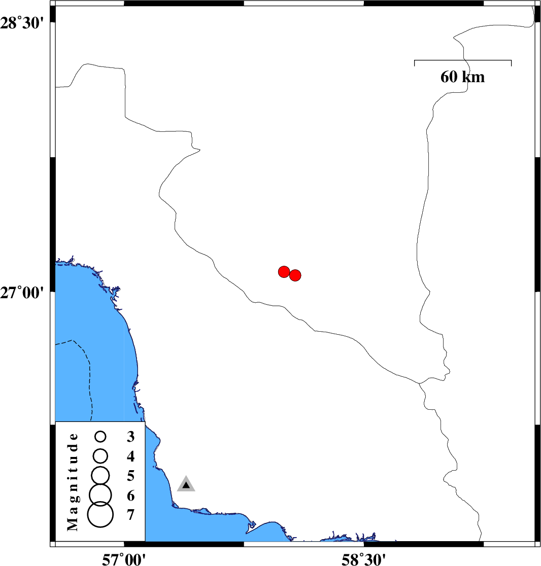 | 2021/01/07 | 05:22:41.1 | 08:52:41.1 | 27.11 | 58 | 10 | ML:3.3 | Kerman Province, 60 km South-East of Manujan |