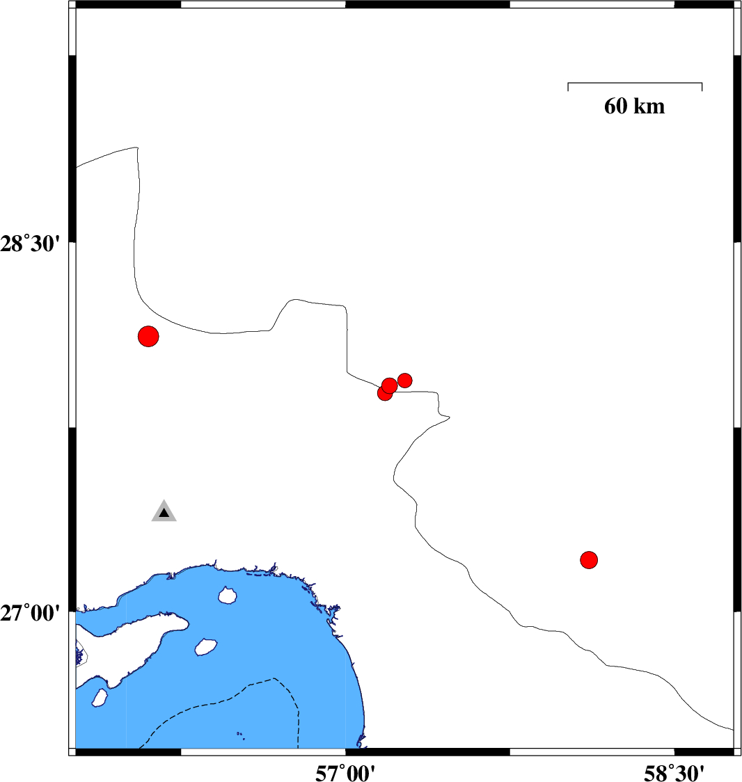 | 2021/01/25 | 20:23:48.1 | 23:53:48.1 | 27.94 | 57.27 | 10 | ML:3 | Kerman Province, 42 km -West of Kahnuj | ||