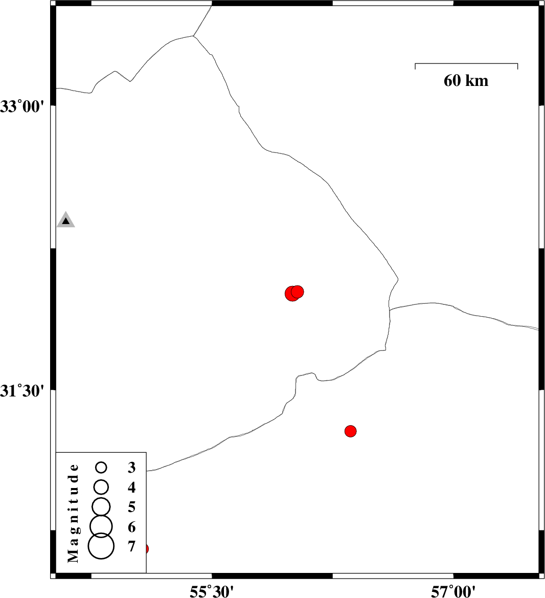 | 2021/01/31 | 00:04:30.5 | 03:34:30.5 | 32.02 | 56.03 | 10 | ML:3.5 | Yazd Province, 76 km North-East of Bafq | ||