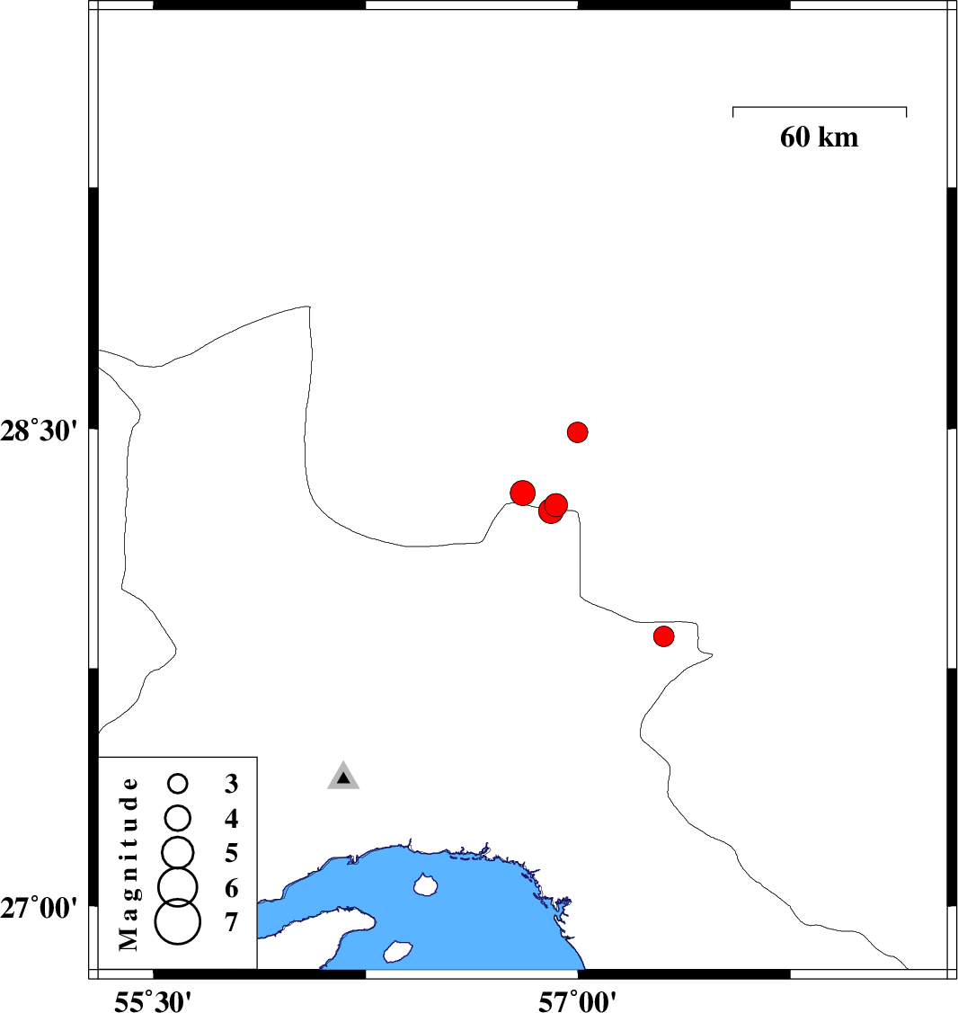 | 2021/03/03 | 03:00:32.6 | 06:30:32.6 | 28.261 | 56.921 | 12 | ML:3.7 | Kerman Province, 100 km -East of Hajiabad | ||