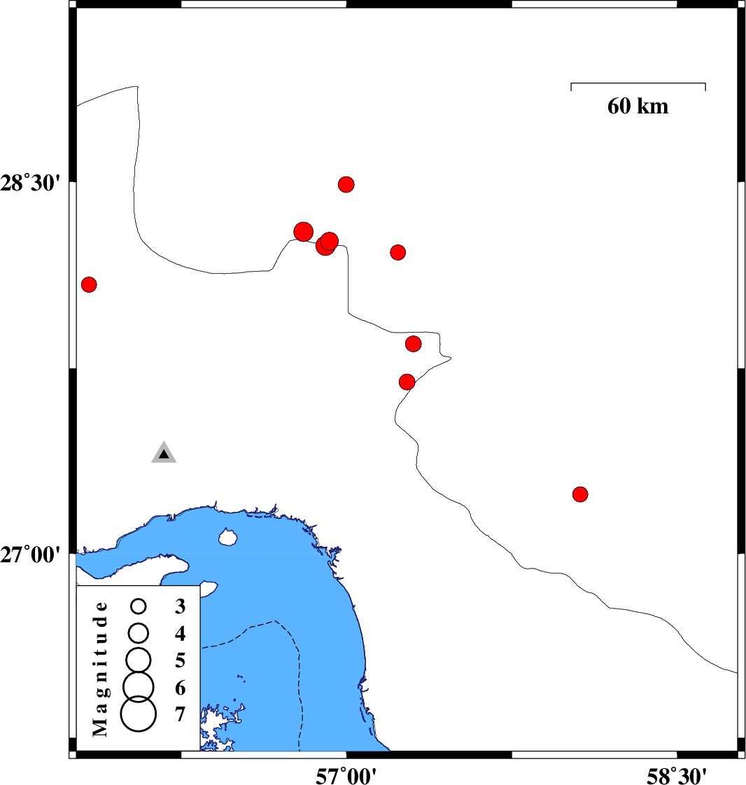 | 2021/02/03 | 22:43:17.8 | 02:13:17.8 | 27.24 | 58.06 | 15 | ML:3.1 | Kerman Province, 59 km South-East of Manujan |