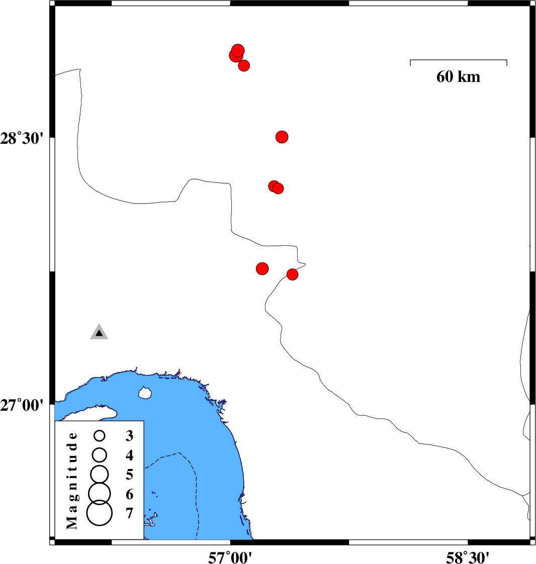 | 2021/04/28 | 05:02:05.0 | 09:32:05.0 | 27.733 | 57.392 | 12 | ML:3.2 | Kerman Province, 37 km North-West of Manujan | ||