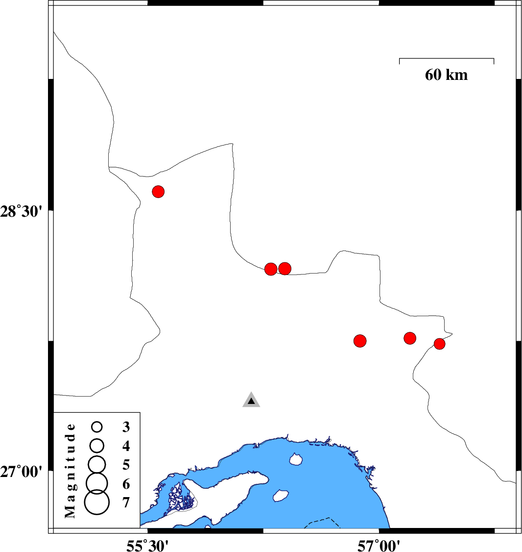 | 2021/04/28 | 05:02:05.0 | 09:32:05.0 | 27.733 | 57.392 | 12 | ML:3.2 | Kerman Province, 37 km North-West of Manujan |