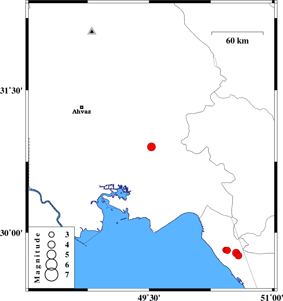 | 2021/08/03 | 16:54:46.7 | 21:24:46.7 | 30.906 | 49.528 | 27 | ML:4.5 | Khoozestan Province, 23 km North-West of Omidiyeh | ||