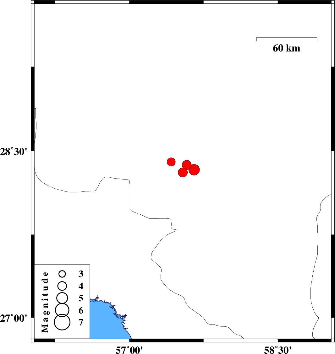 | 2021/08/12 | 12:24:06.2 | 16:54:06.2 | 28.332 | 57.655 | 16 | ML:5 | Kerman Province, 38 km South of Jiroft | ||