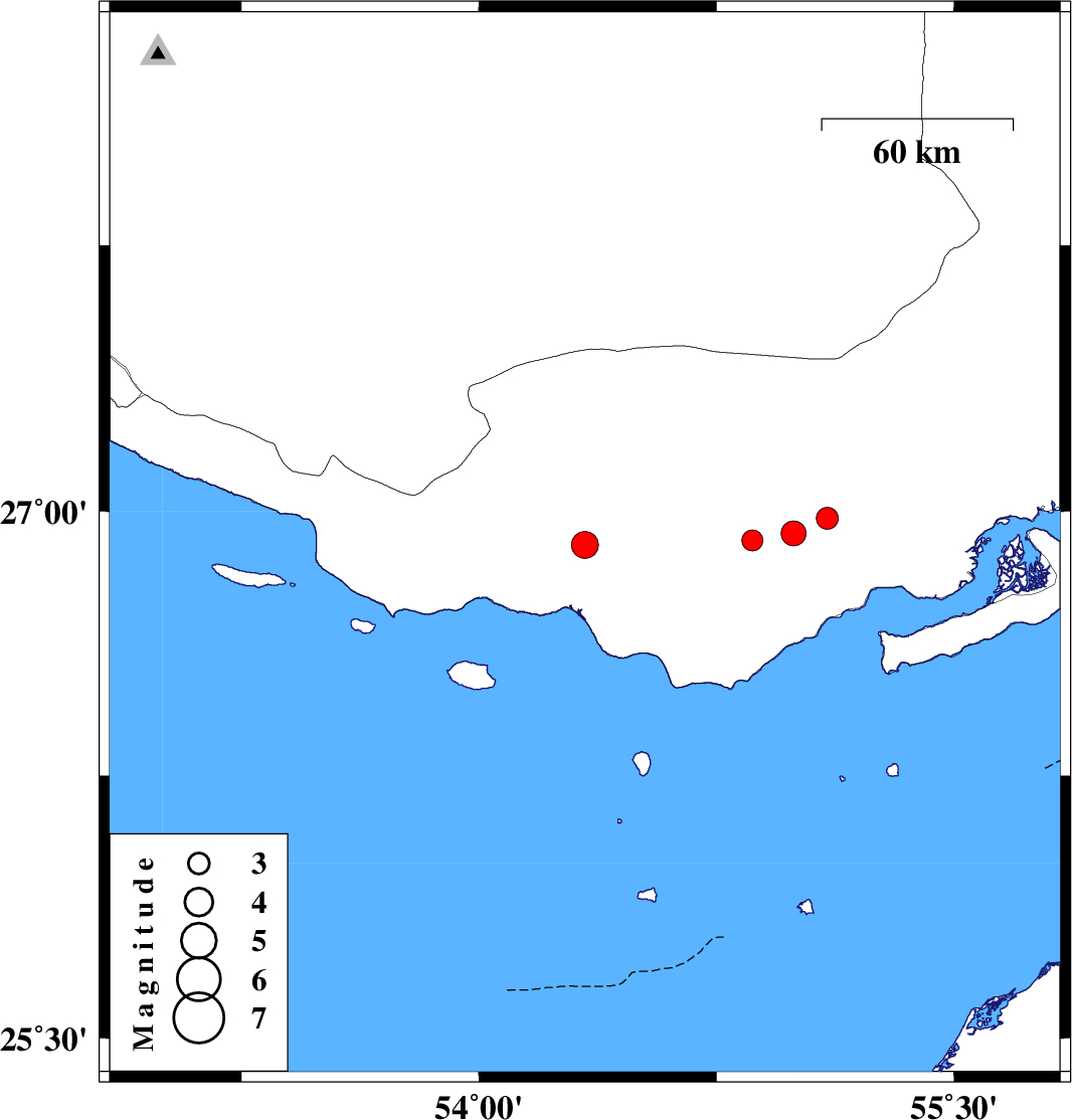 | 2021/07/12 | 17:45:29.2 | 22:15:29.2 | 26.981 | 55.099 | 12 | ML:3.1 | Hormozgan Province, 56 km North-East of Bandar-e lengeh |