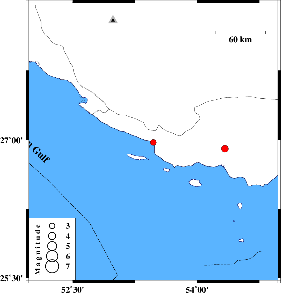 | 2021/08/23 | 22:49:12.2 | 03:19:12.2 | 26.973 | 53.472 | 12 | ML:3.3 | Hormozgan Province, 50 km South-East of Lamerd | ||