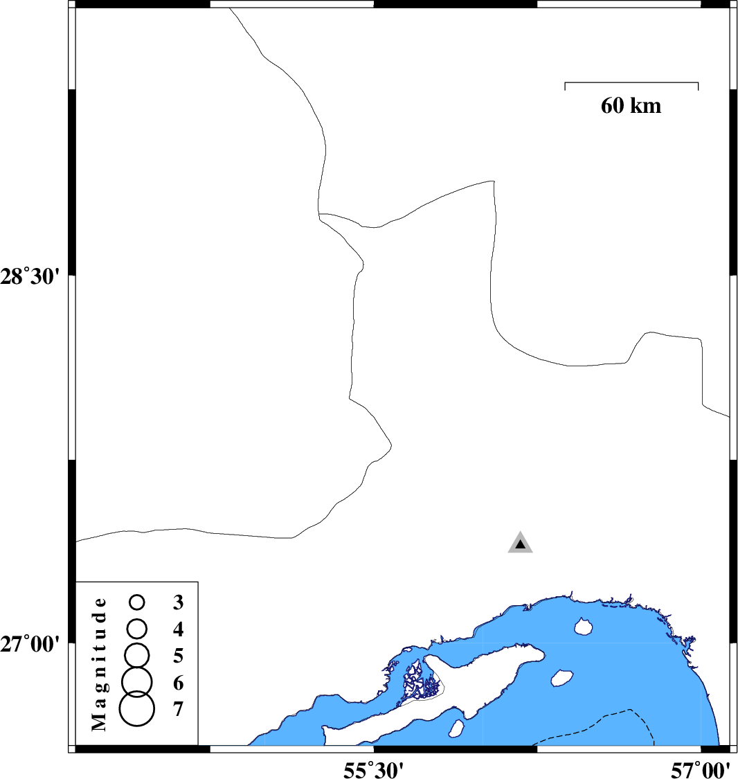 | 2021/08/22 | 22:27:49.2 | 02:57:49.2 | 28.078 | 55.632 | 12 | ML:4.1 | Hormozgan Province, 37 km South-West of Hajiabad |