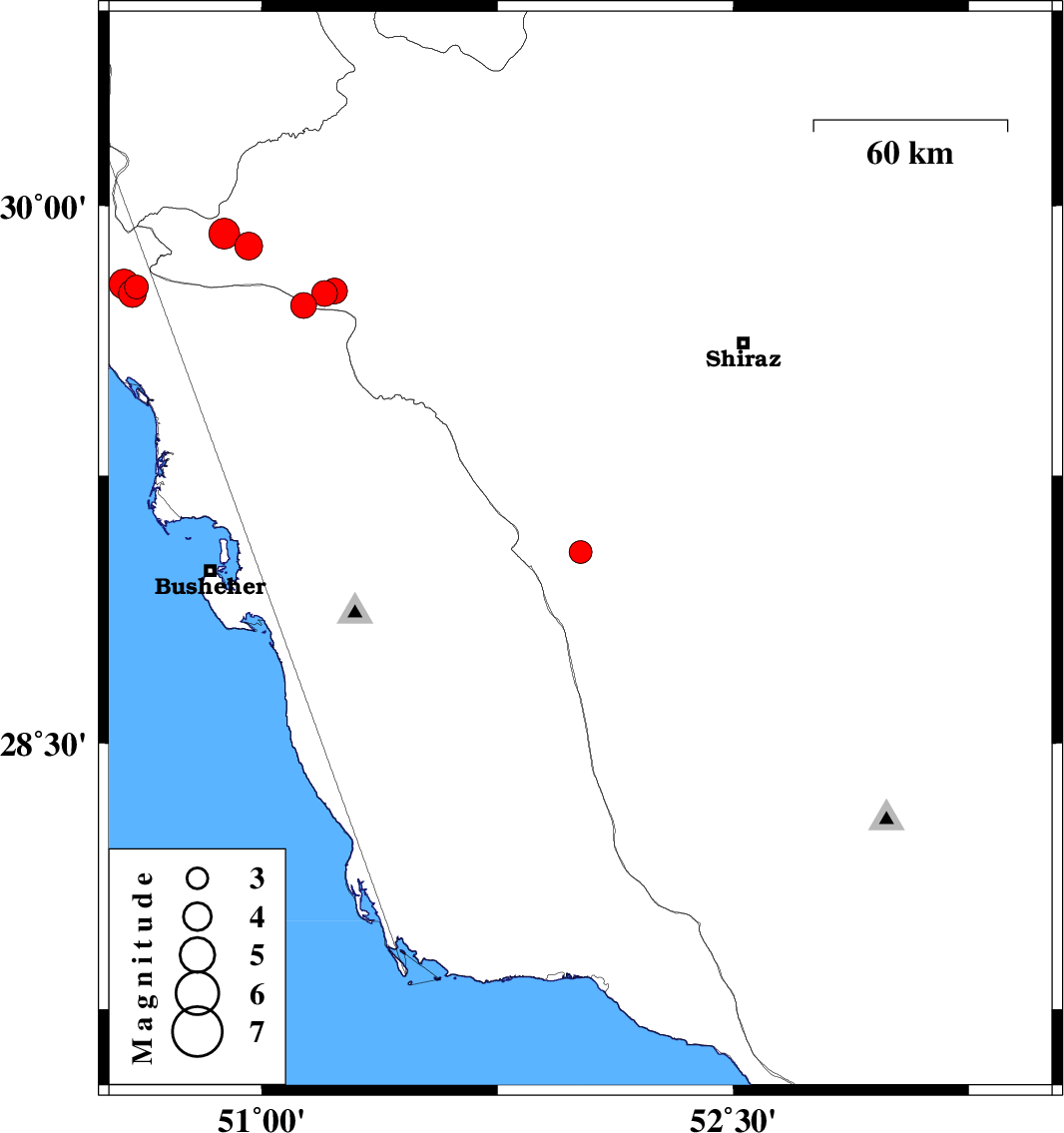 | 2021/08/18 | 05:16:46.0 | 09:46:46.0 | 29.723 | 51.133 | 32 | ML:3.7 | Bushehr Province, 52 km North of Borazjan | ||