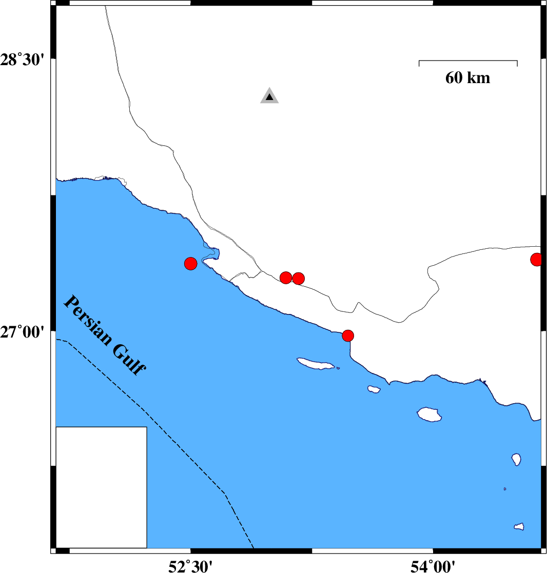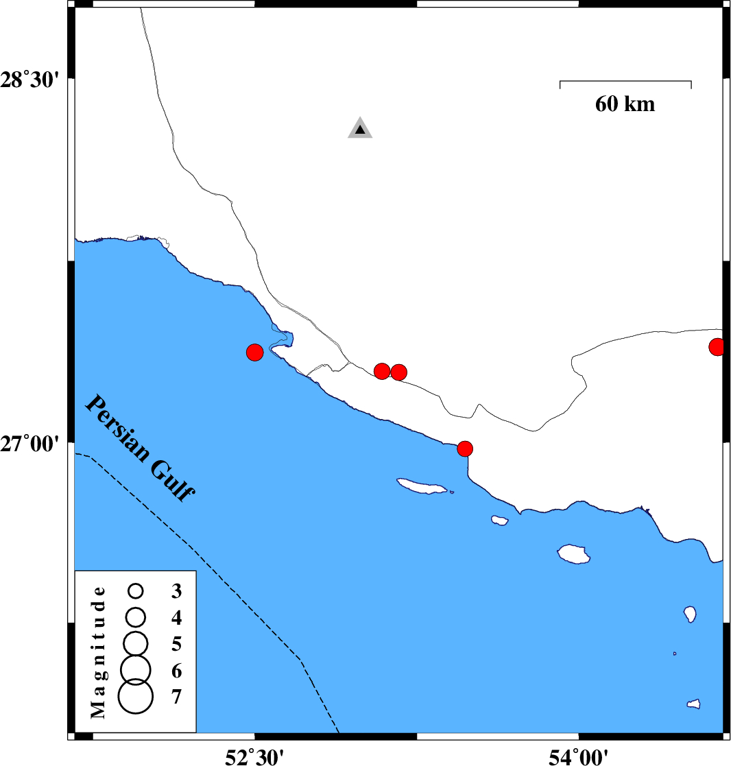 | 2021/09/19 | 22:11:08.1 | 02:41:08.1 | 27.372 | 52.5 | 12 | ML:3.5 | Persian Gulf, 43 km South-West of Mehr | ||