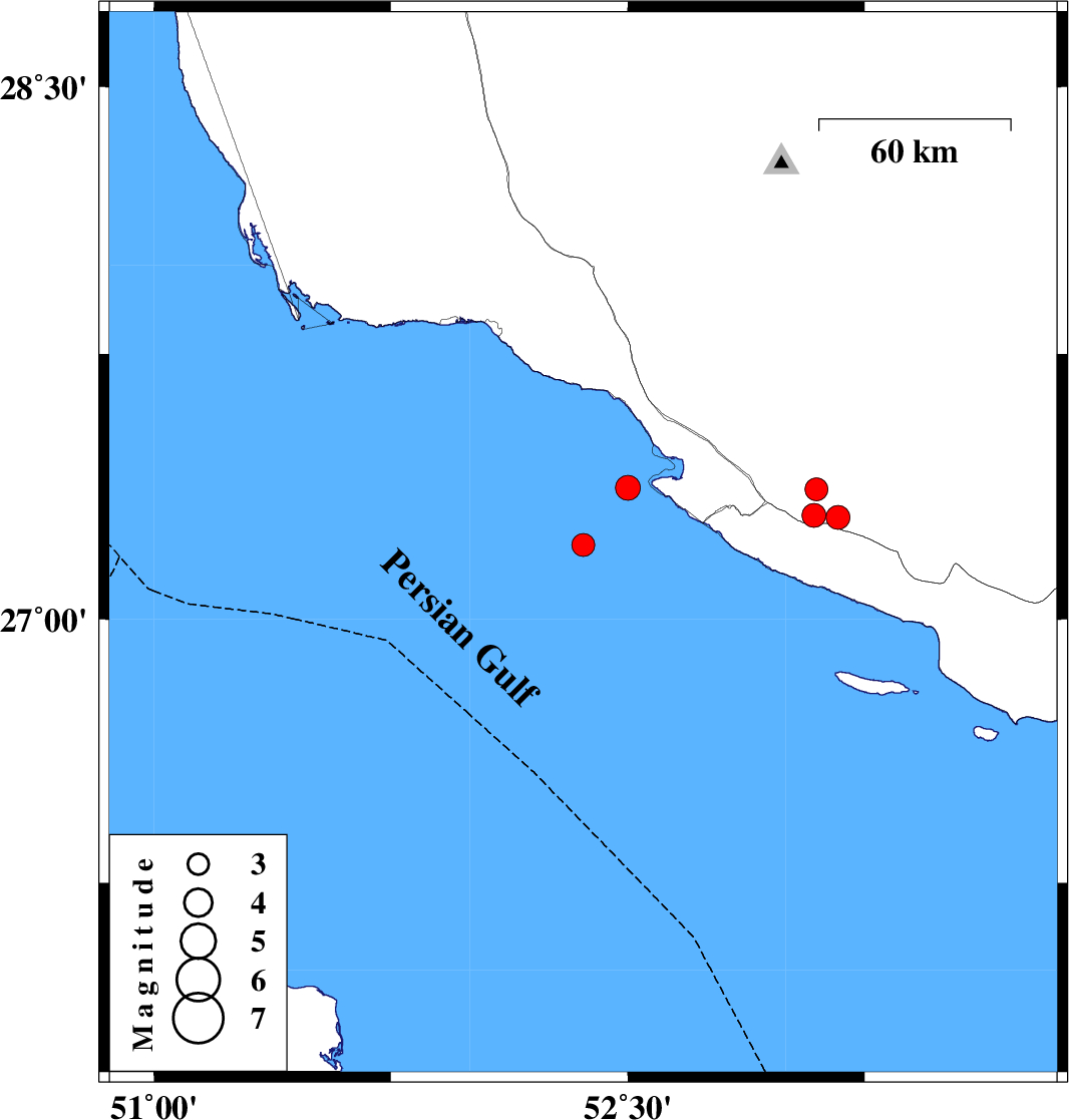 | 2021/09/19 | 22:11:08.1 | 02:41:08.1 | 27.372 | 52.5 | 12 | ML:3.5 | Persian Gulf, 43 km South-West of Mehr |
