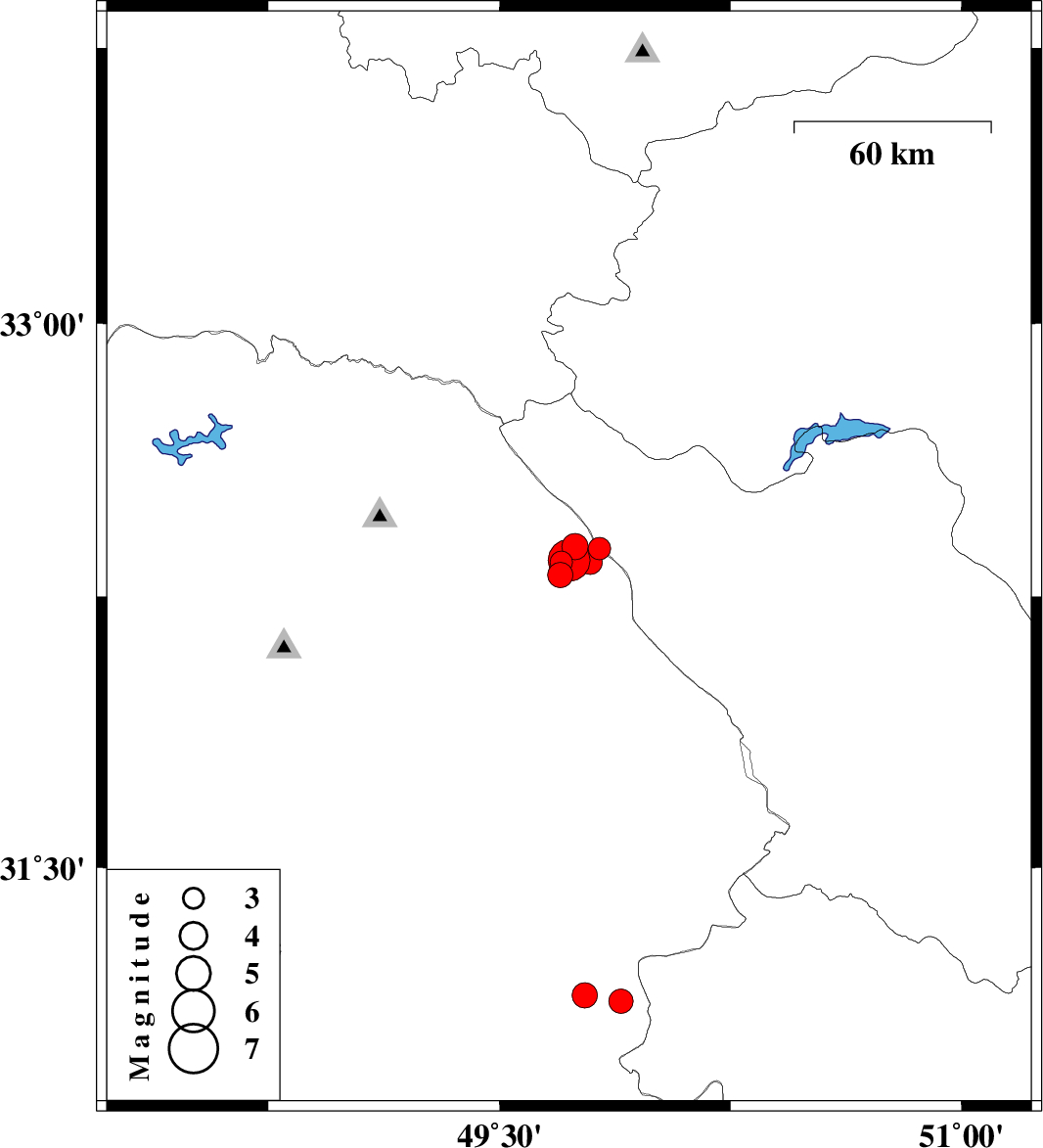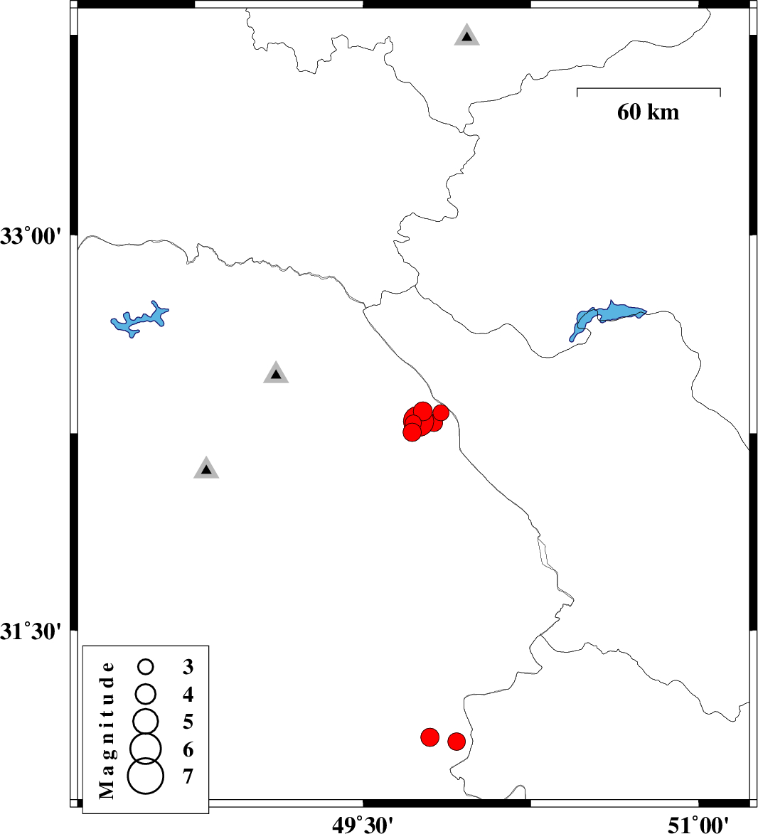 | 2021/10/04 | 07:47:44.0 | 11:17:44.0 | 32.309 | 49.697 | 18 | ML:3.7 | Khoozestan Province, 43 km South-West of Chelgard | ||