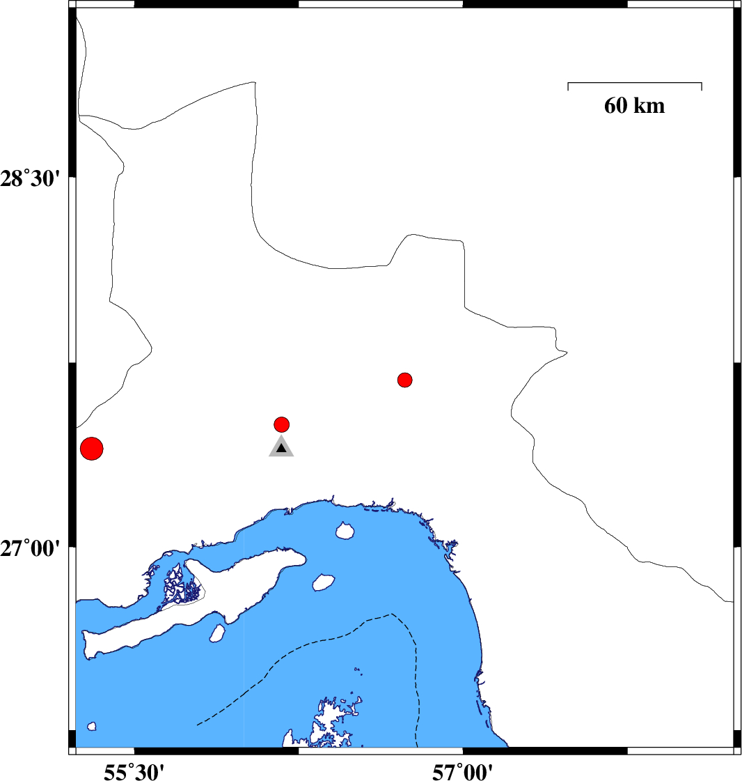 | 2021/10/10 | 16:11:25.8 | 19:41:25.8 | 27.401 | 55.305 | 12 | ML:4.7 | Hormozgan Province, 96 km North-East of Bastak |