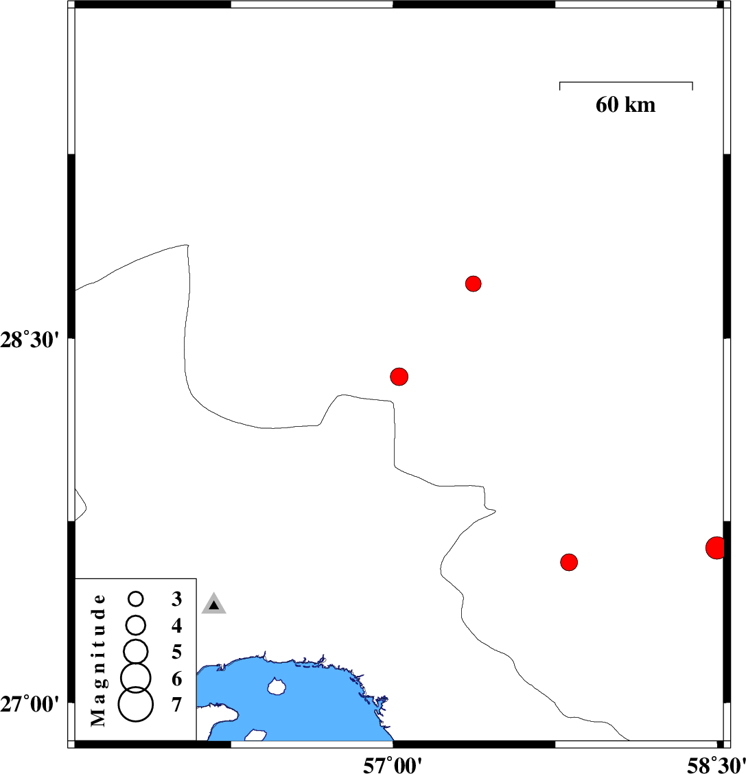 | 2021/10/21 | 06:05:14.8 | 09:35:14.8 | 27.639 | 58.498 | 12 | ML:4.7 | Kerman Province, 86 km South-East of Kahnuj | ||
