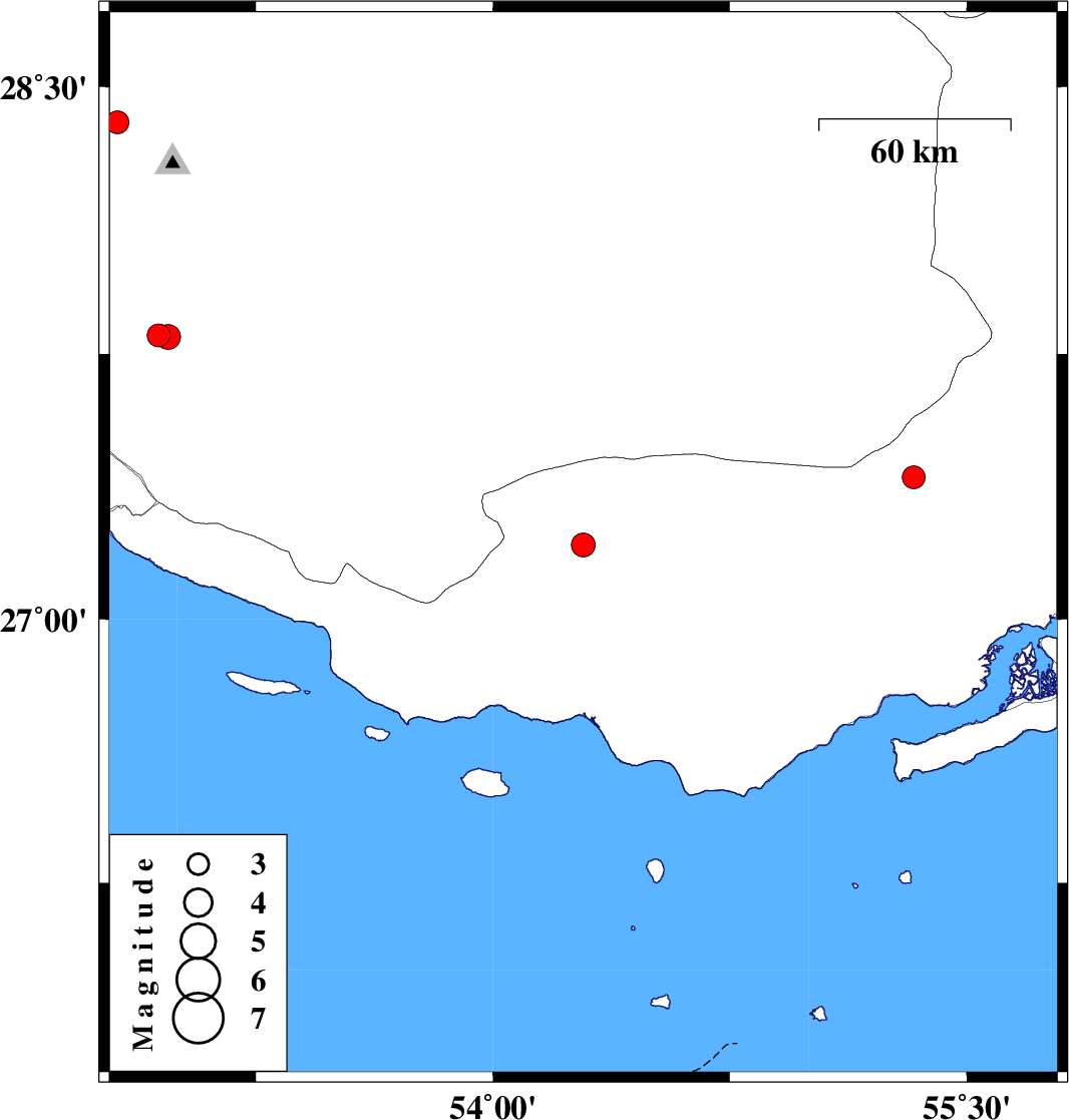 | 2021/10/31 | 07:49:13.3 | 11:19:13.3 | 27.798 | 52.972 | 10 | ML:3.5 | Fars Province, 29 km North of Mehr | ||