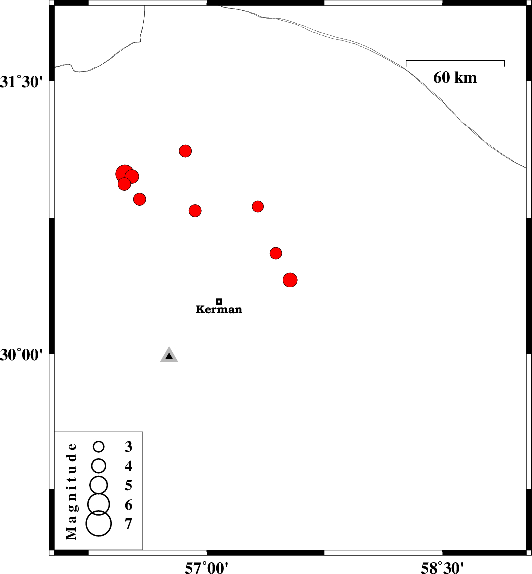| 2021/11/09 | 19:31:53.1 | 23:01:53.1 | 30.409 | 57.532 | 12 | ML:4.1 | Kerman Province, 46 km North-East of Kerman | ||