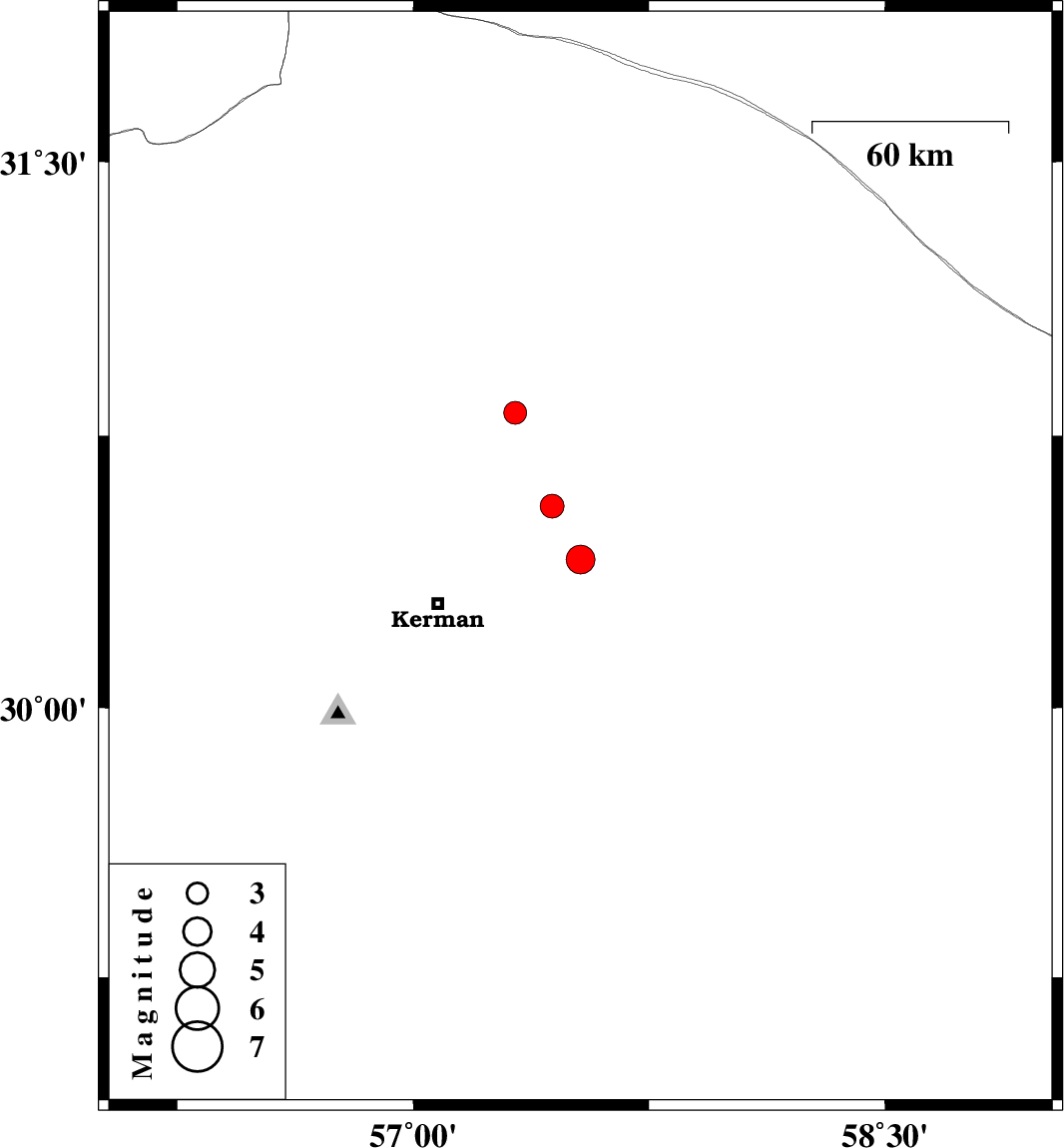 | 2021/11/09 | 19:31:53.1 | 23:01:53.1 | 30.409 | 57.532 | 12 | ML:4.1 | Kerman Province, 46 km North-East of Kerman | ||