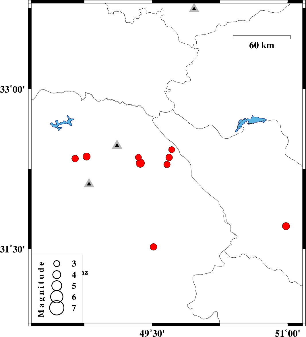 | 2021/10/17 | 08:46:42.9 | 12:16:42.9 | 32.432 | 49.717 | 12 | ML:3.1 | Khoozestan Province, 38 km -West of Chelgard | ||