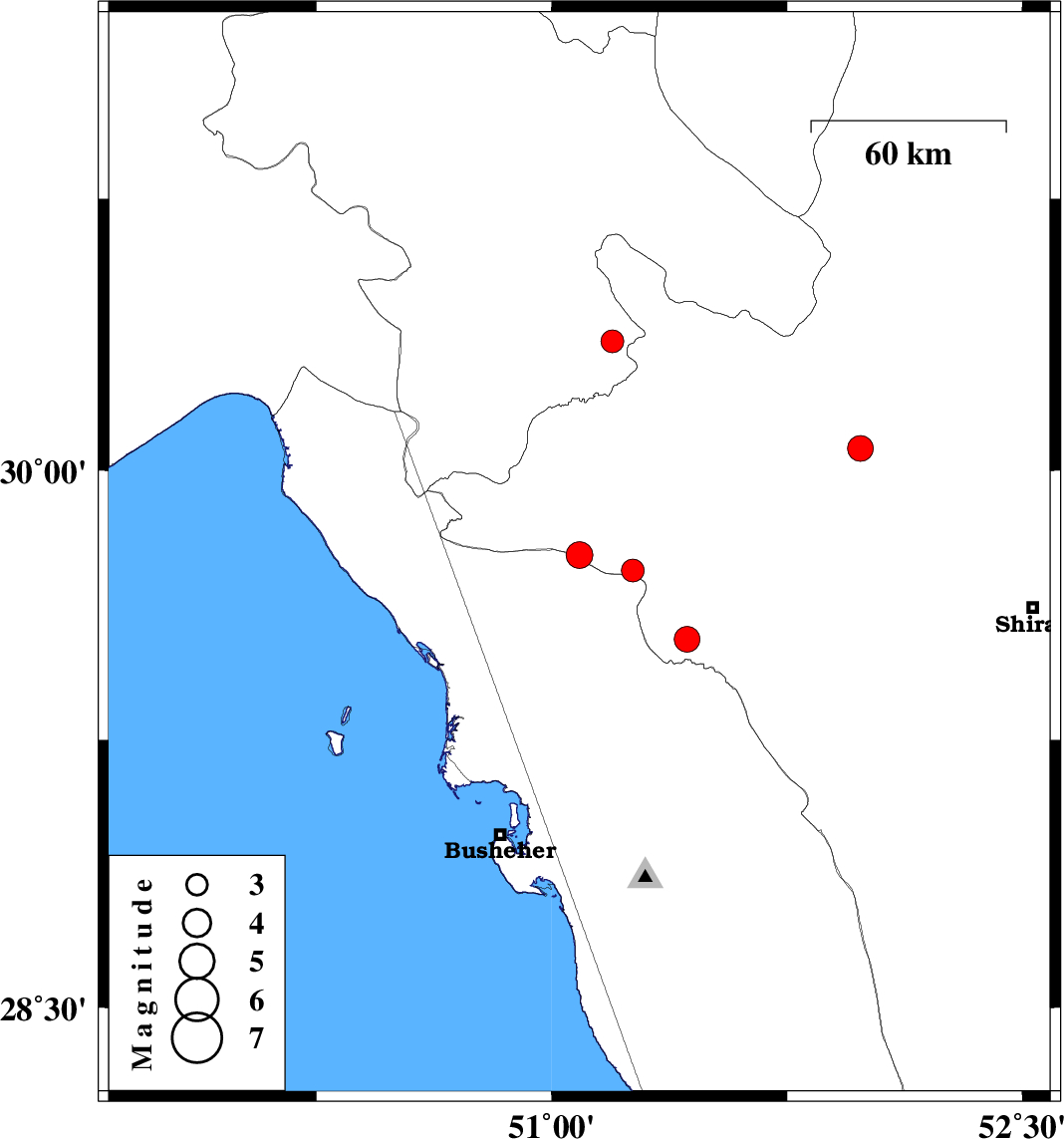 | 2021/12/22 | 00:06:23.2 | 03:36:23.2 | 29.722 | 51.258 | 12 | ML:3.2 | Fars Province, 40 km North-West of Kazerun | ||