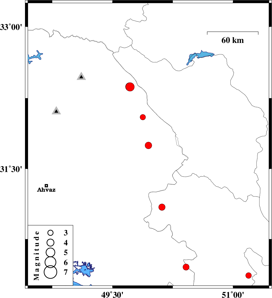 | 2021/12/26 | 22:04:44.5 | 01:34:44.5 | 32.049 | 49.877 | 12 | ML:3.1 | Khoozestan Province, 24 km North of Izeh | ||