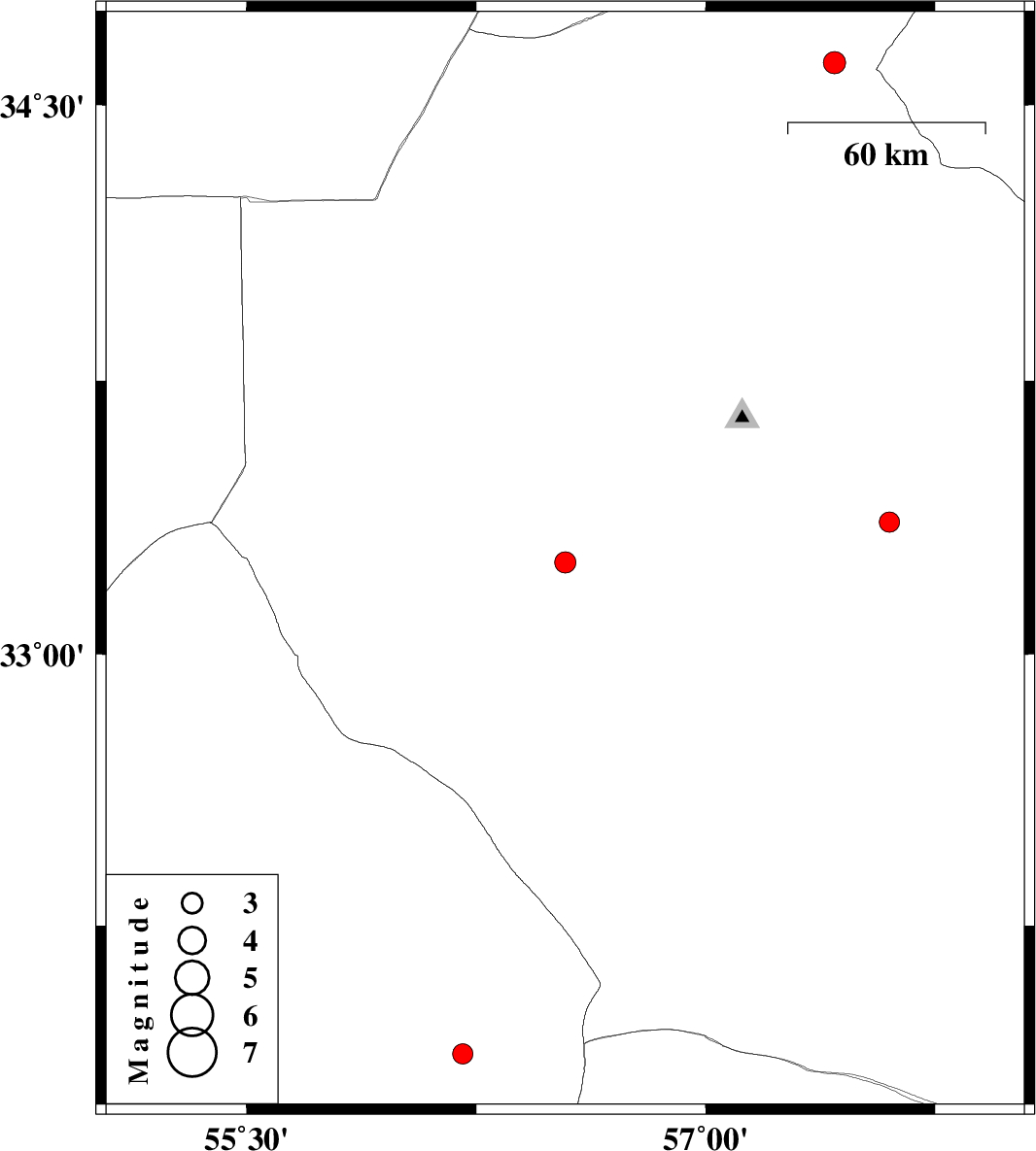 | 2022/01/23 | 16:09:19.2 | 19:39:19.2 | 33.364 | 57.6 | 10 | ML:3 | Yazd Province, 68 km South-East of Tabas | ||
