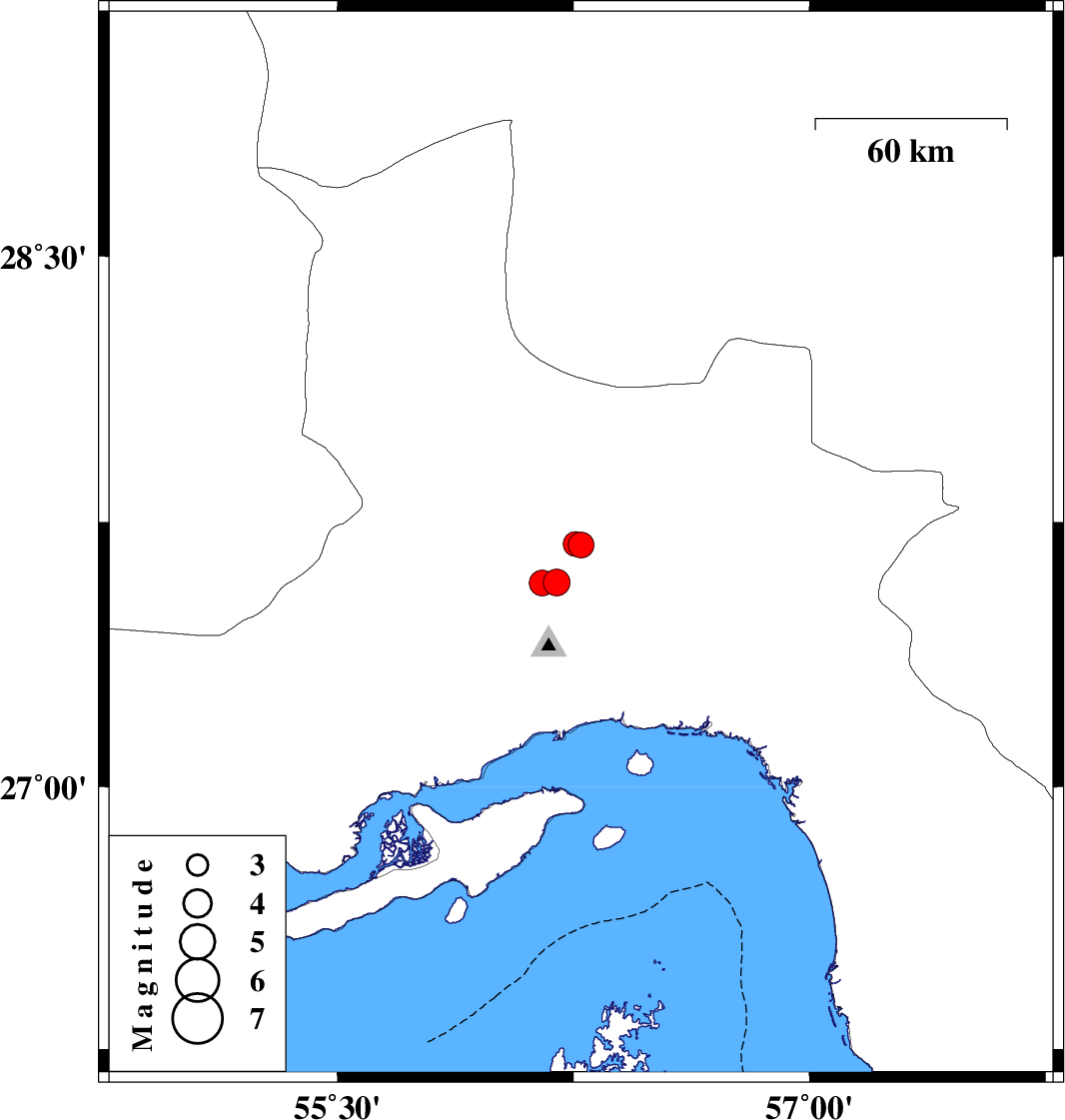 | 2022/02/07 | 23:55:58.9 | 03:25:58.9 | 27.58 | 56.196 | 15 | ML:3.8 | Hormozgan Province, 45 km North of Bandar-e abbas | ||