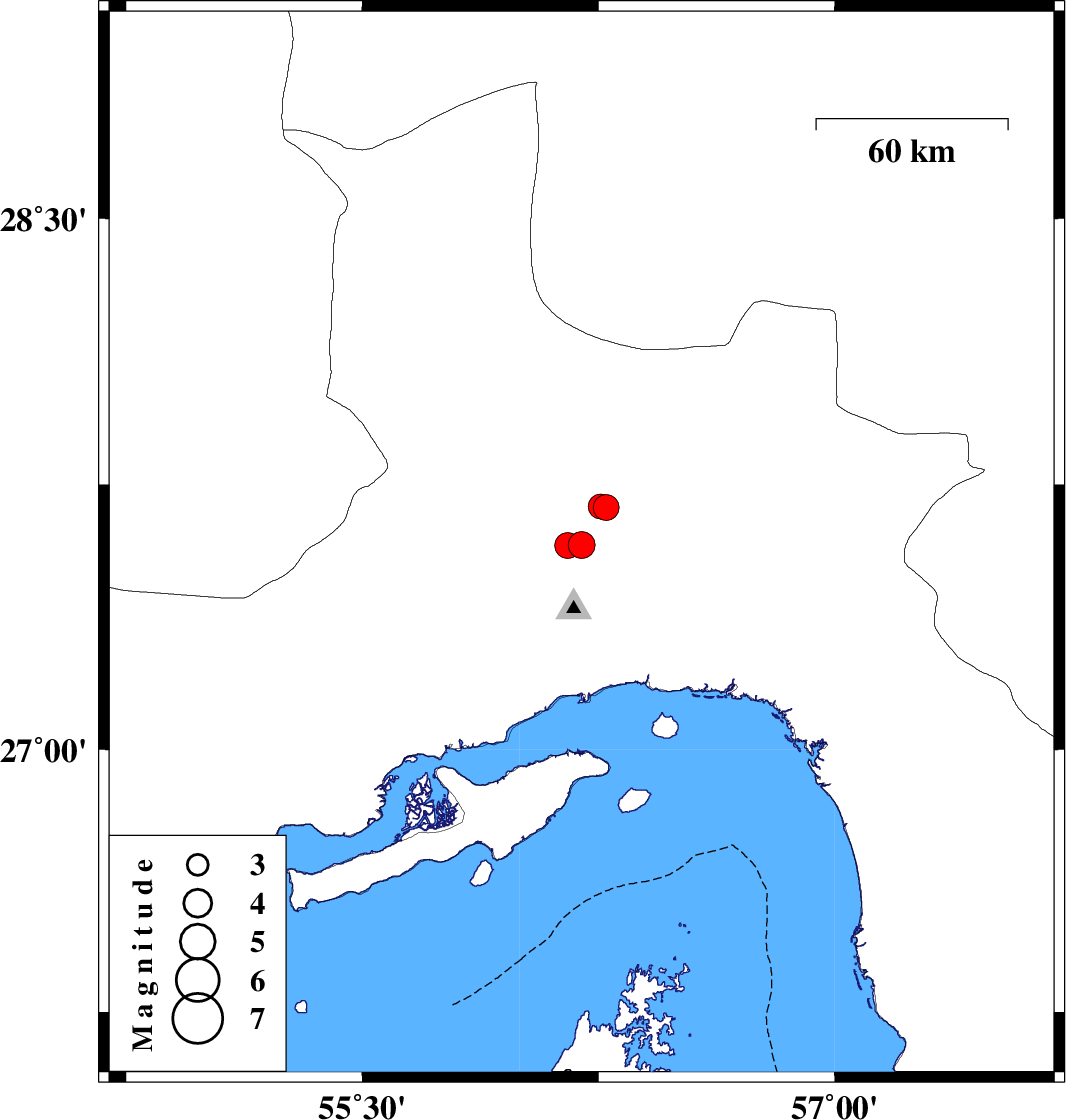 | 2022/02/07 | 23:55:58.9 | 03:25:58.9 | 27.58 | 56.196 | 15 | ML:3.8 | Hormozgan Province, 45 km North of Bandar-e abbas | ||