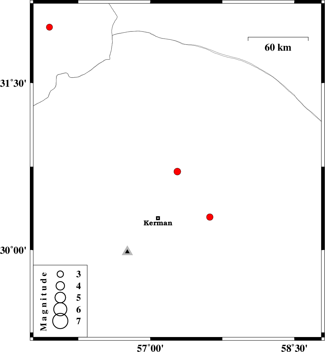 | 2022/03/01 | 00:39:59.3 | 04:09:59.3 | 30.707 | 57.281 | 12 | ML:3.2 | Kerman Province, 50 km North-East of Kerman | ||