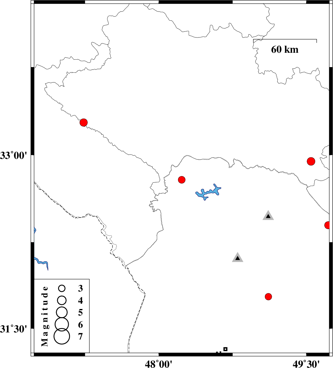 | 2022/02/17 | 09:35:40.3 | 13:05:40.3 | 32.788 | 48.233 | 10 | ML:3.3 | Khoozestan Province, 38 km North-West of Andimeshk | ||