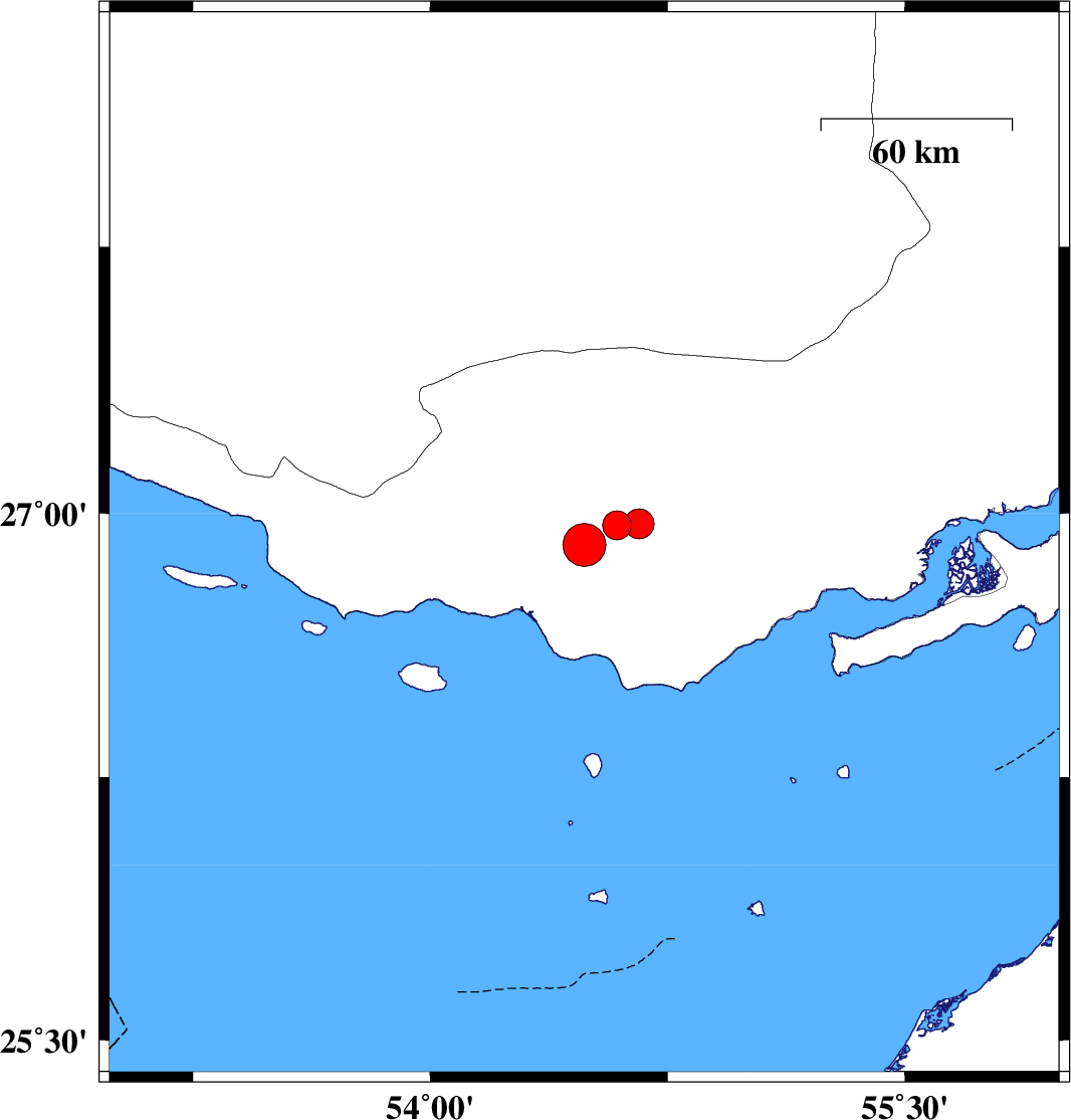 | 2022/03/16 | 23:27:29.4 | 02:57:29.4 | 26.97 | 54.661 | 18 | ML:4.3 | Hormozgan Province, 39 km South-East of Bastak | ||
