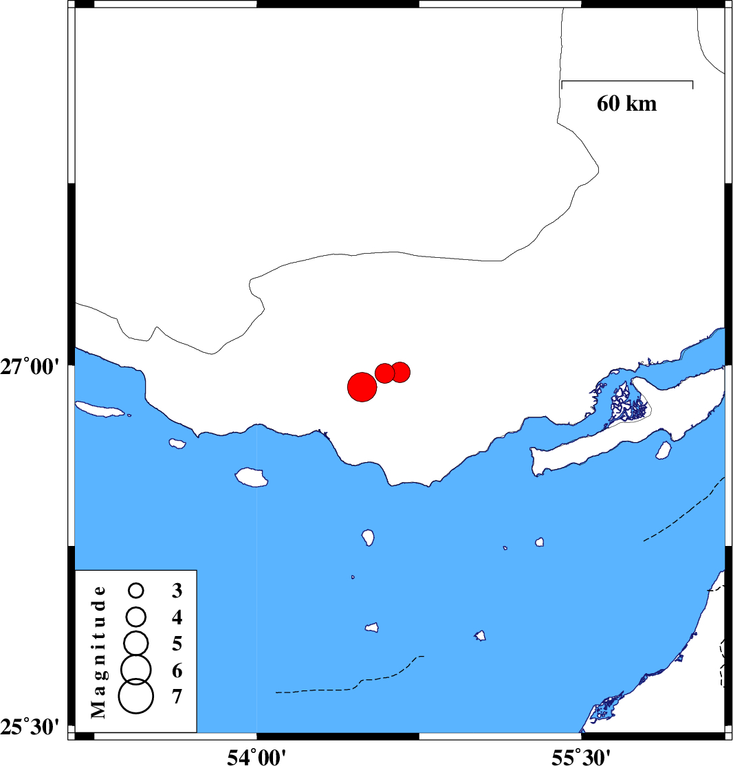 | 2022/03/16 | 23:15:44.0 | 02:45:44.0 | 26.91 | 54.487 | 15 | ML:6.1 | Hormozgan Province, 34 km South-East of Bastak |
