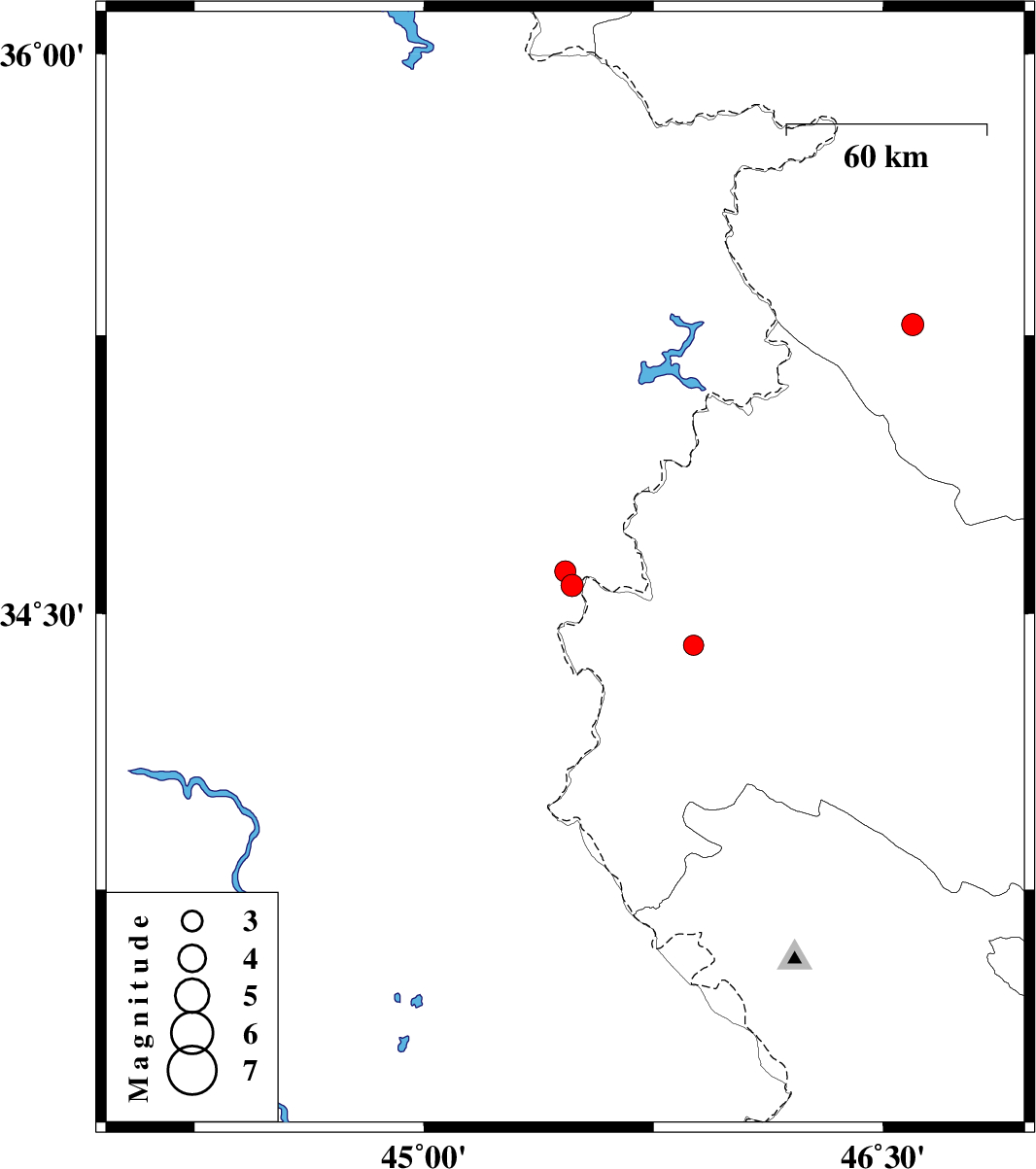 | 2022/04/02 | 12:05:45.0 | 16:35:45.0 | 34.576 | 45.483 | 12 | ML:3.2 | Iraq, 11 km -West of Qasr-E-Shirin | ||
