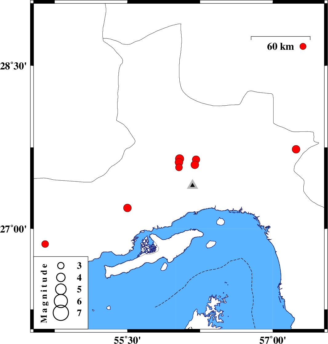 | 2022/04/27 | 19:30:12.2 | 00:00:12.2 | 27.732 | 57.24 | 14 | ML:3.7 | Hormozgan Province, 34 km North of Dehbarez | ||