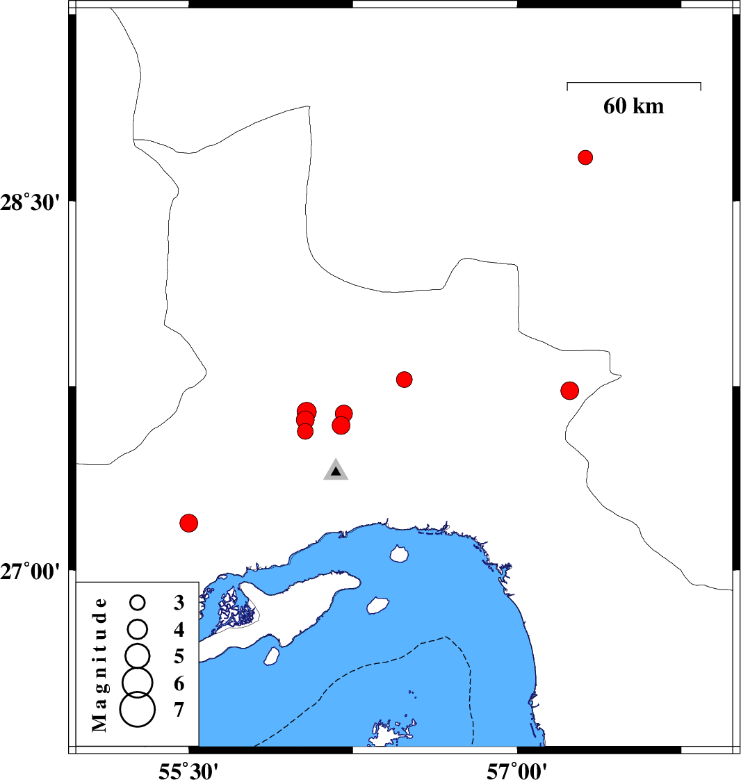 | 2022/04/27 | 03:03:09.6 | 07:33:09.6 | 27.566 | 56.032 | 12 | ML:3.3 | Hormozgan Province, 49 km North-West of Bandar-e abbas | ||