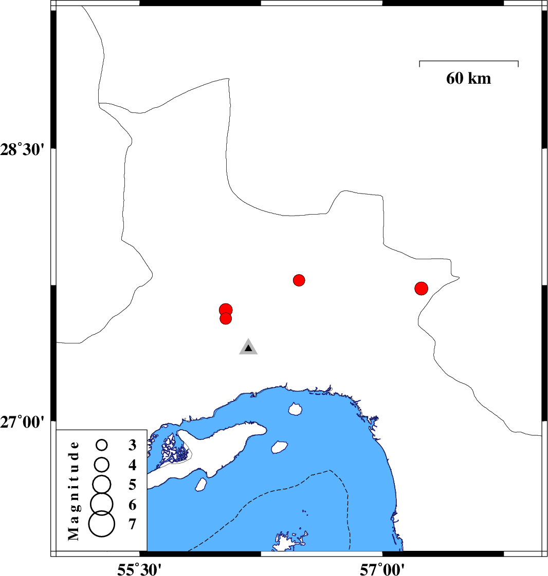 | 2022/04/27 | 03:03:09.6 | 07:33:09.6 | 27.566 | 56.032 | 12 | ML:3.3 | Hormozgan Province, 49 km North-West of Bandar-e abbas | ||