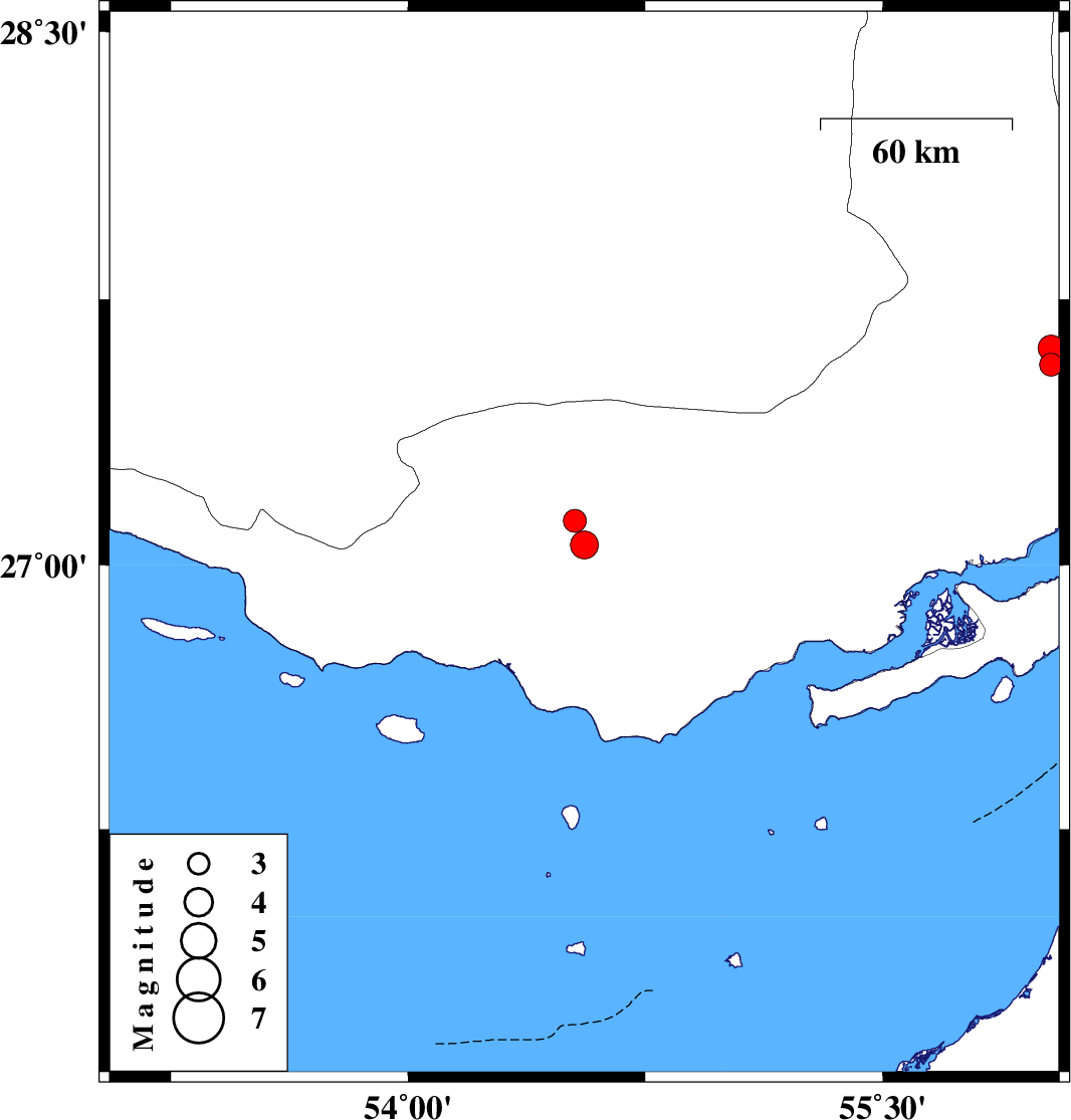 | 2022/04/30 | 20:05:52.4 | 00:35:52.4 | 27.058 | 54.557 | 21 | ML:4 | Hormozgan Province, 25 km South-East of Bastak | ||