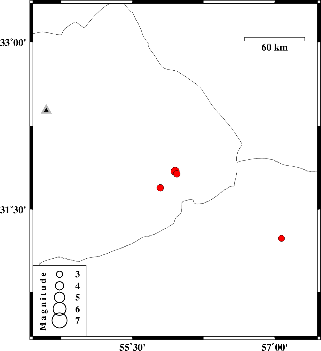 | 2022/05/11 | 13:49:26.6 | 18:19:26.6 | 31.237 | 57.072 | 12 | ML:3 | Kerman Province, 25 km -East of Ravar |