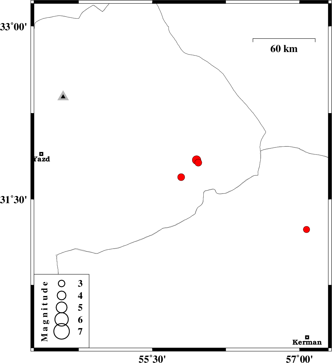 | 2022/05/11 | 13:49:26.6 | 18:19:26.6 | 31.237 | 57.072 | 12 | ML:3 | Kerman Province, 25 km -East of Ravar |