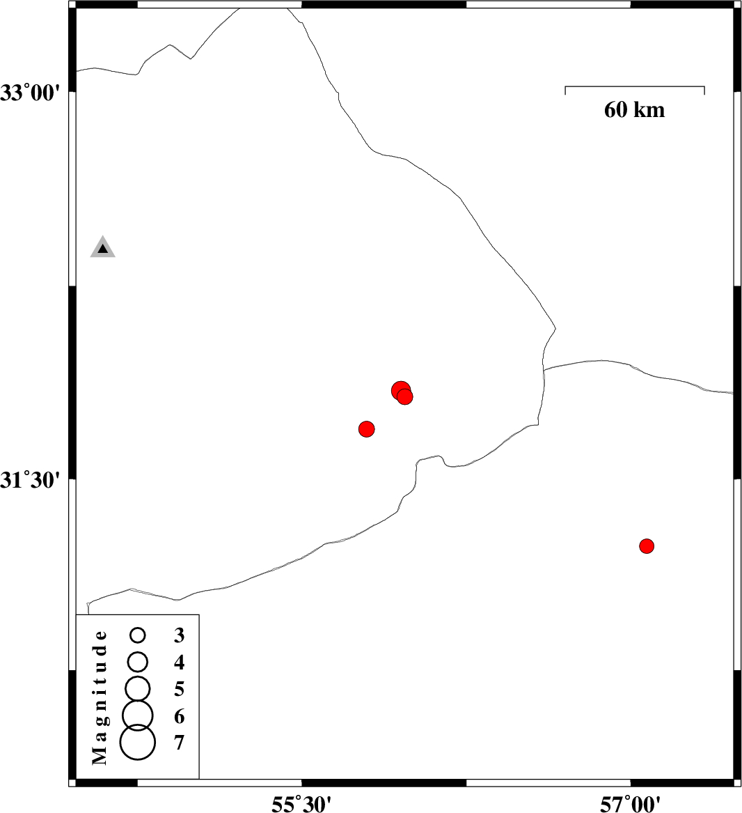 | 2022/05/11 | 13:49:26.6 | 18:19:26.6 | 31.237 | 57.072 | 12 | ML:3 | Kerman Province, 25 km -East of Ravar |