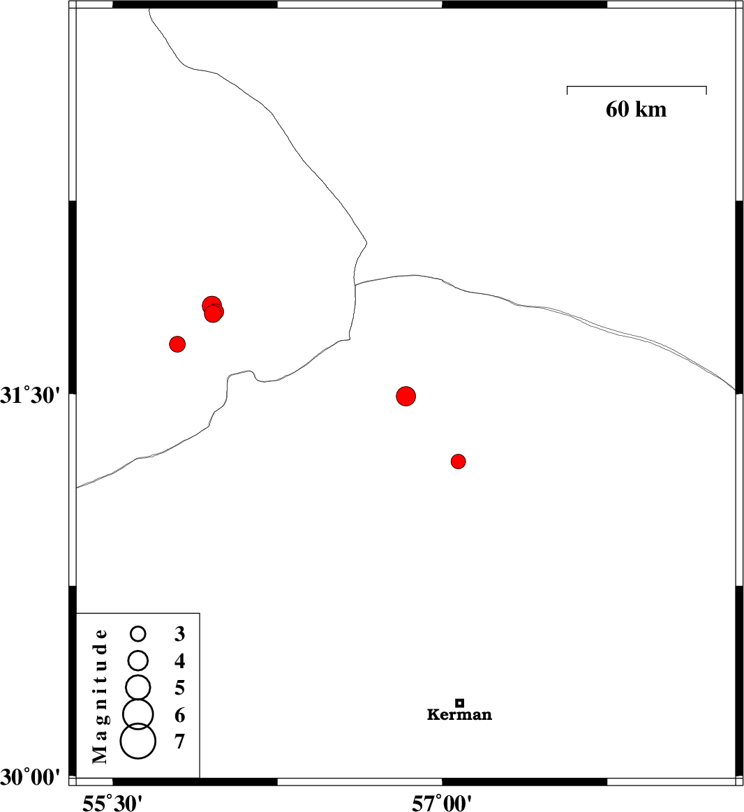 | 2022/05/11 | 13:49:26.6 | 18:19:26.6 | 31.237 | 57.072 | 12 | ML:3 | Kerman Province, 25 km -East of Ravar |