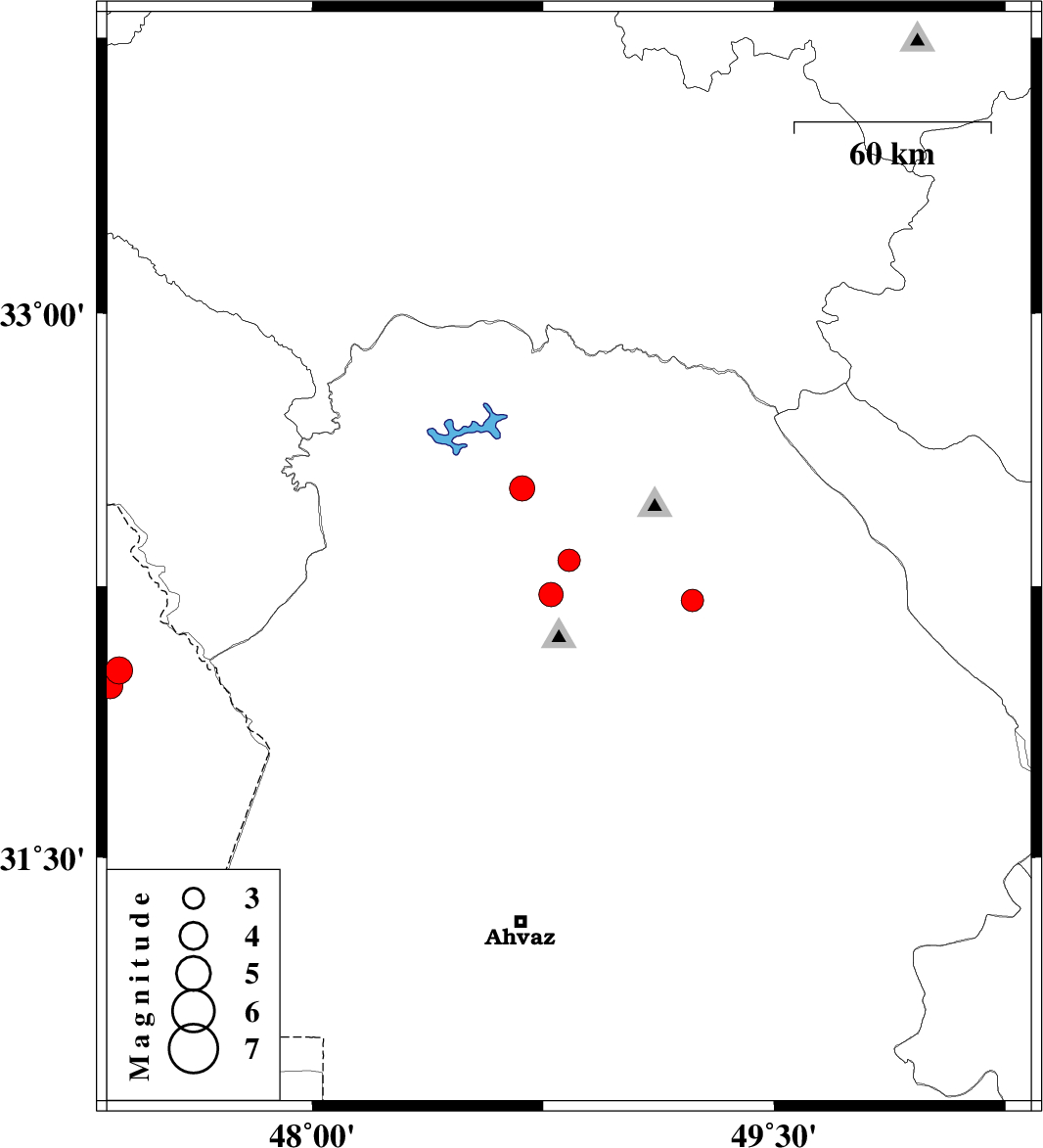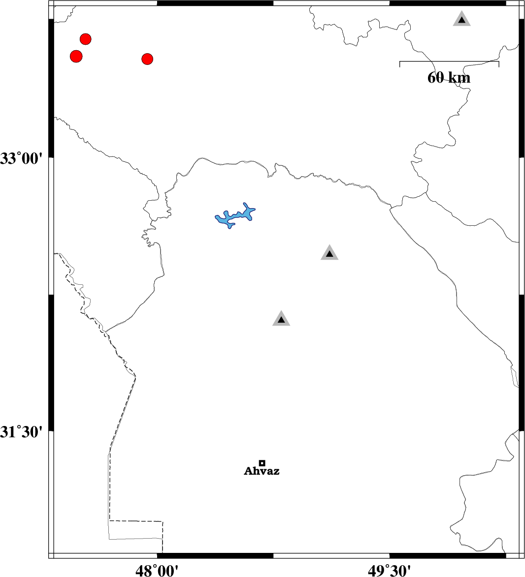 | 2022/04/25 | 07:39:24.3 | 12:09:24.3 | 32.519 | 48.681 | 12 | ML:3.6 | Khoozestan Province, 32 km -East of Andimeshk |