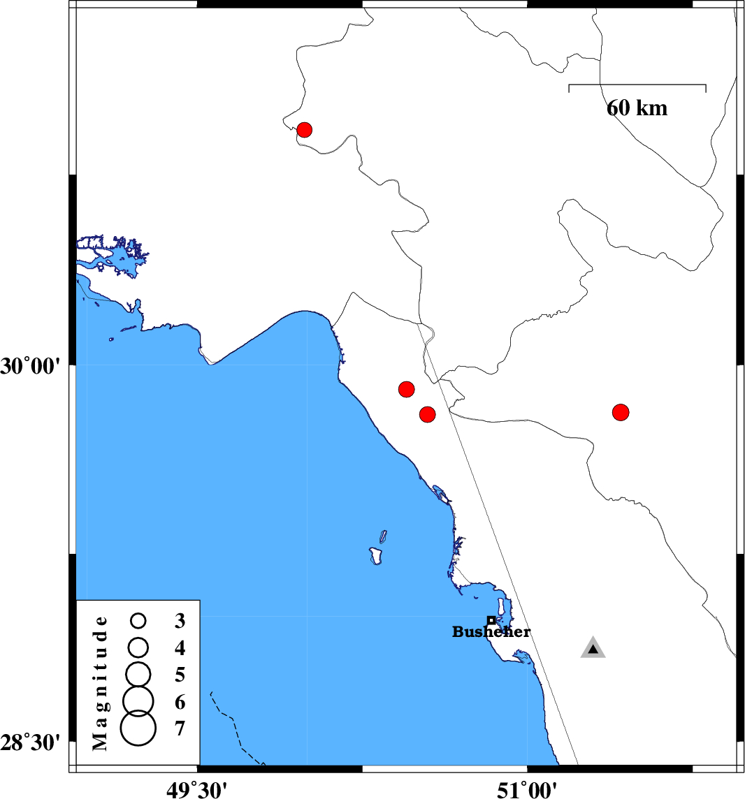| 2022/05/01 | 03:43:00.3 | 08:13:00.3 | 29.812 | 51.424 | 12 | ML:3.4 | Fars Province, 35 km South of Nurabad |