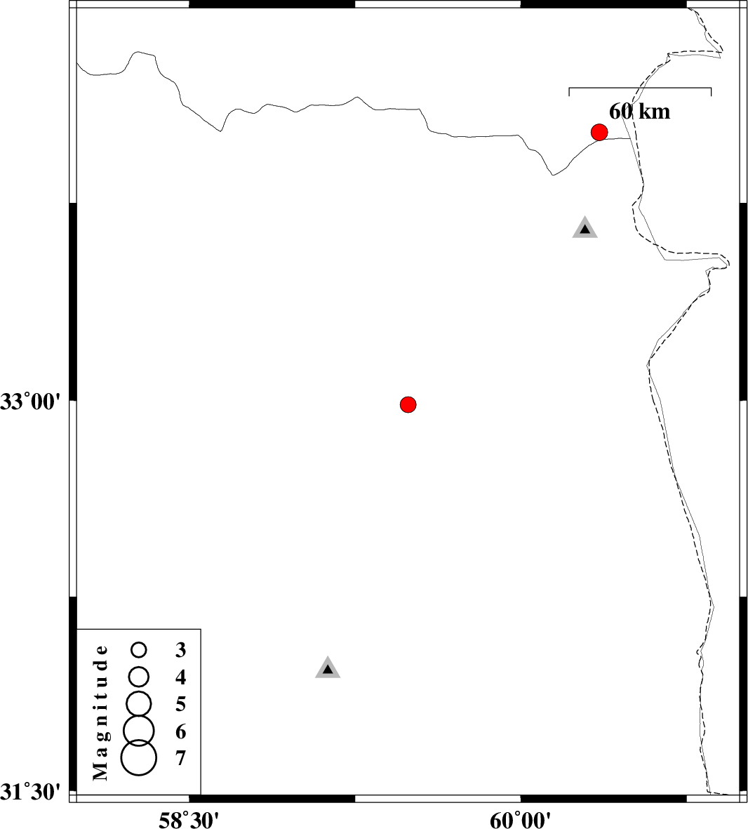 | 2022/06/04 | 20:00:02.2 | 00:30:02.2 | 32.984 | 59.49 | 15 | ML:3.2 | Khorasan(south) Province, 26 km -East of Birjand | ||