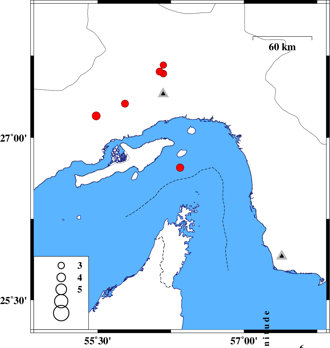 | 2022/05/25 | 05:41:16.6 | 10:11:16.6 | 27.585 | 56.173 | 6 | ML:3.3 | Hormozgan Province, 46 km North-West of Bandar-e abbas |
